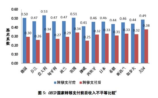 从OECD国家经验来看,二次分配政策使OECD国家的基尼系数平均下降了25%,相对贫困人口减少了55%。主要OECD国家在转移支付前的基尼系数都比较高,而通过转移支付的再分配,基尼系数都有显著下降。